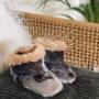 Bemærk det er et 100% håndlavet produkt så millimeter afvigelser kan forekomme i mål. Hjemmeskoen giver sig lidt ved brug og vil derfor vokse med barnets fod.